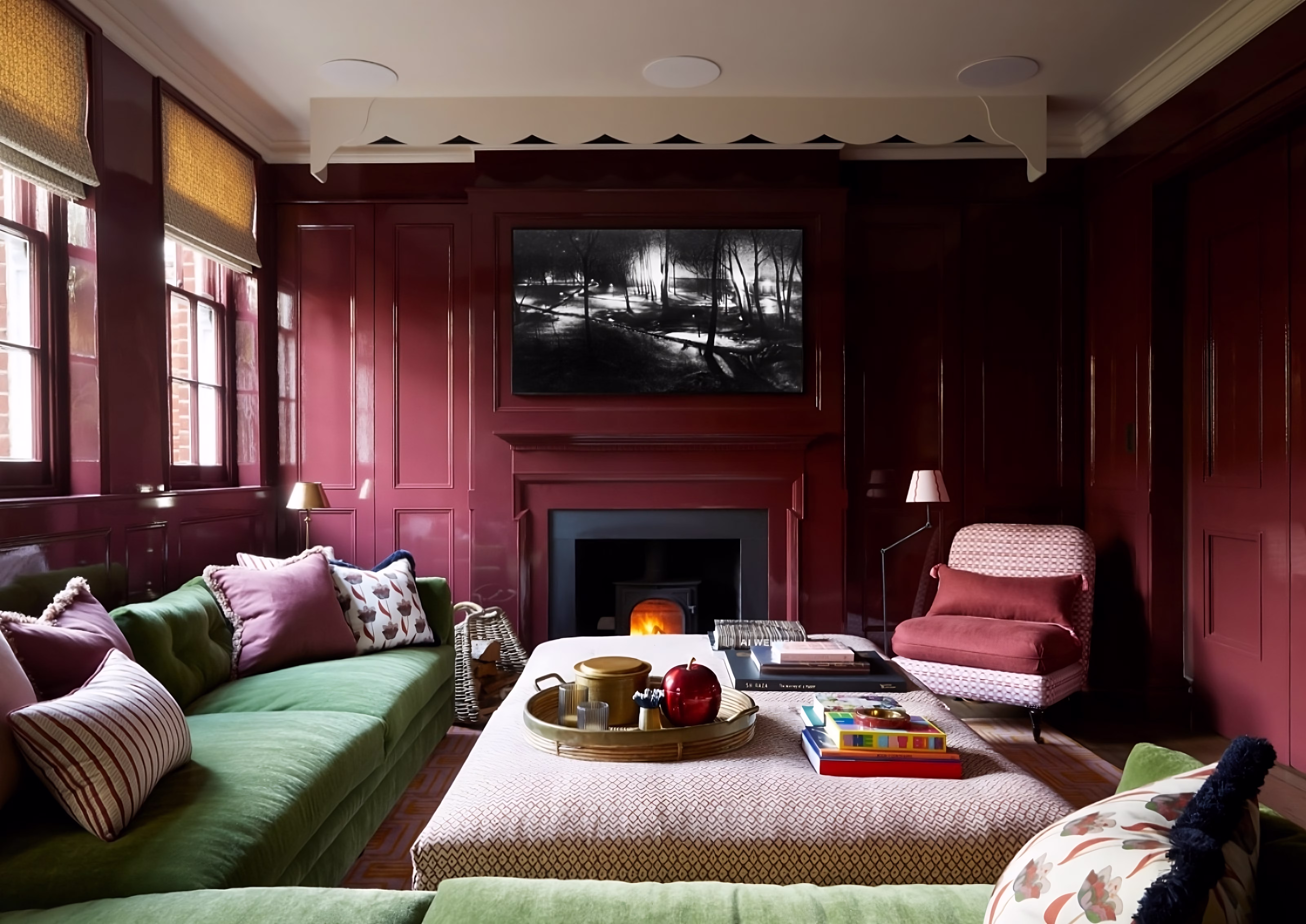We redecorated this reception room, carefully preparing the original wood panelling and hand-painting it in Grenache by Paint & Paper Library. The high-gloss finish adds depth and richness while respecting the character of the space.