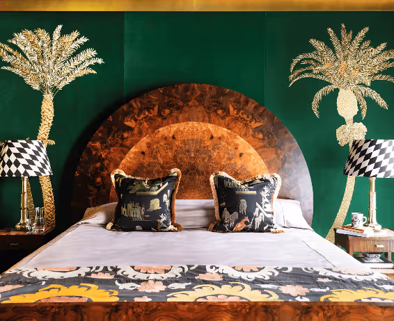 Embroidered upholstery-based wallcoverings like Deco Palms are handmade and then stretched onto wall spaces to create texture and detail. The result is a richly layered surface that adds a tactile element to the room, making the space feel ultra luxurious. Let them shine by contrasting them with smoother textures.