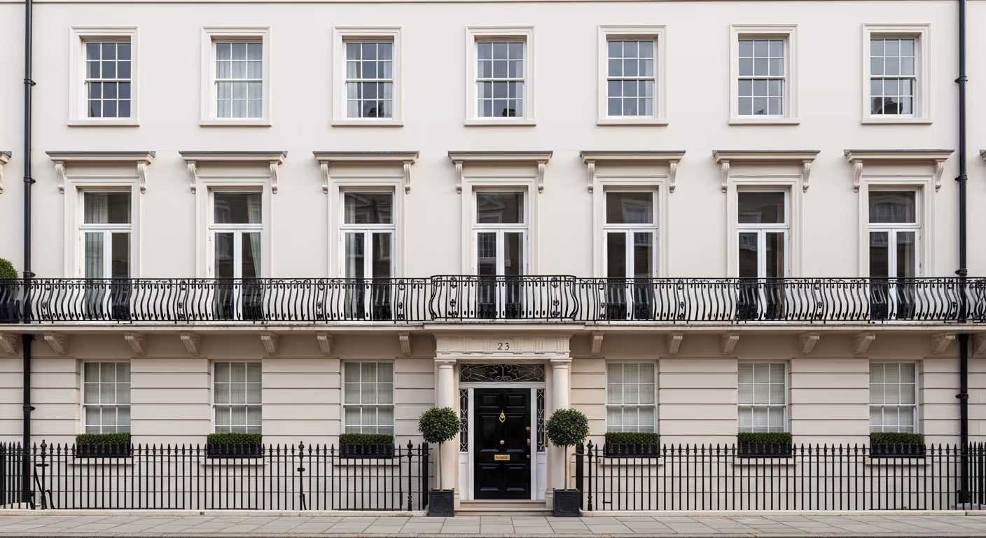 Many Belgravia exteriors are not one material. A single elevation can include stucco, stone details, ironwork, timber joinery, and sometimes painted brick at lower levels or side returns.