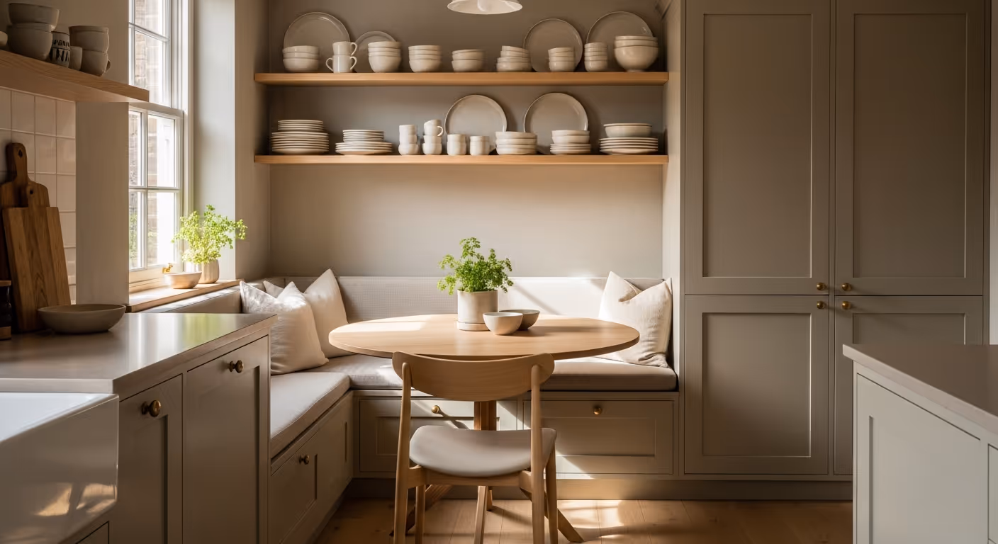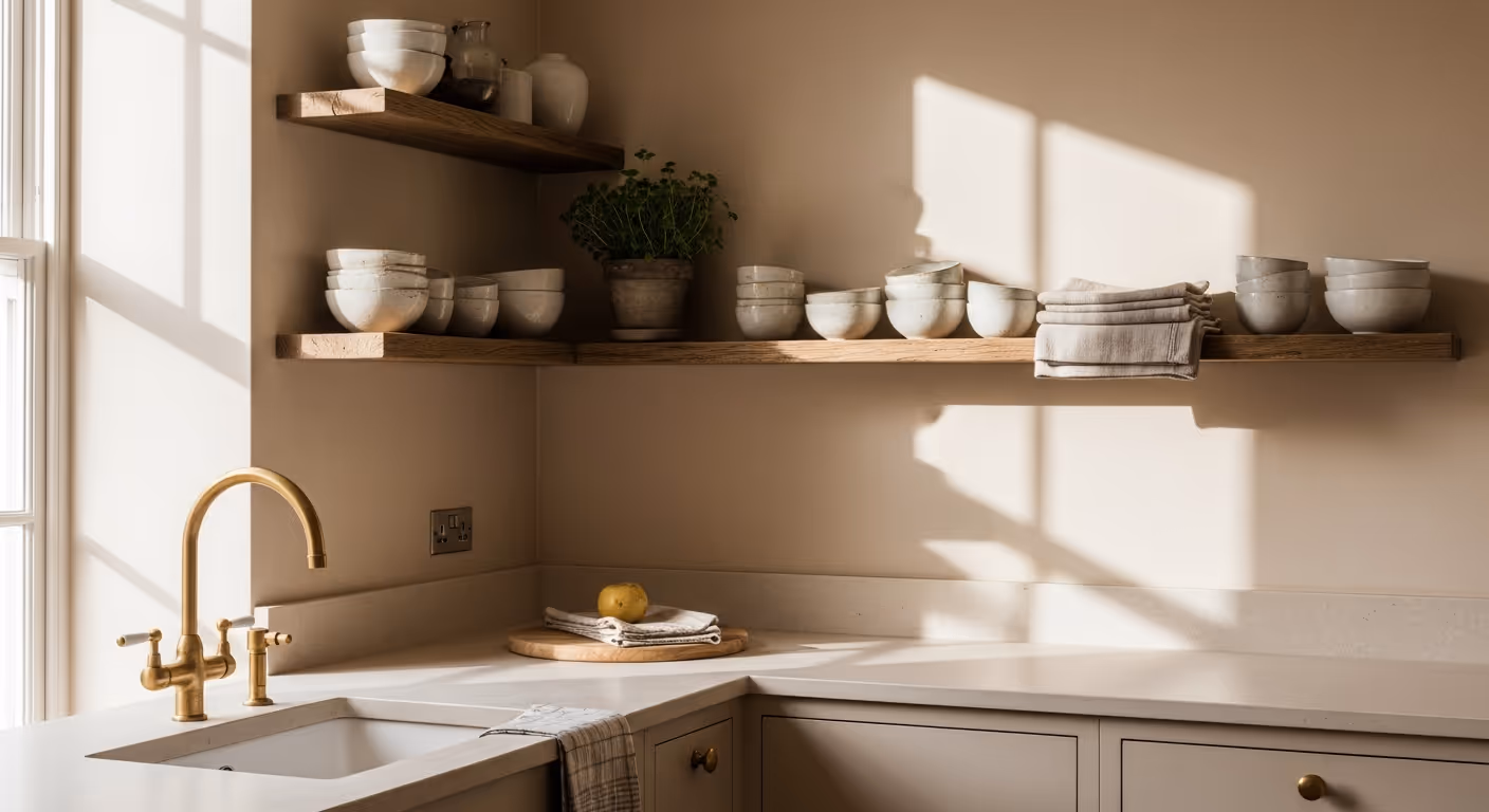 Small rooms and strong light can make colours shift more than you expect. Pale warm neutrals feel calm in north light and suit brass and stone. Cooler neutrals feel clean around chrome and white sanitaryware. If your kitchen or bathroom has strong task lighting, view samples under those lights as well as in daylight. Limewash shows soft movement, so pick a tone that stays gentle across the day. Test panels are your friend. We can place two or three options and let you live with them for a day before you decide.