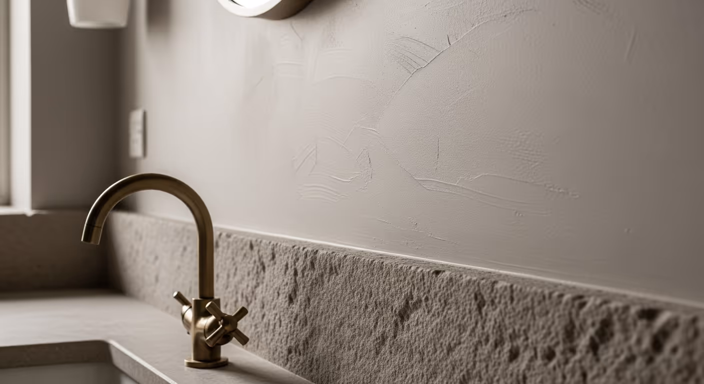 Do not use pure limewash inside a shower enclosure or right next to a bath lip. These zones need a water resistant system. We make the join neat so the room reads as one space without a hard visual break.