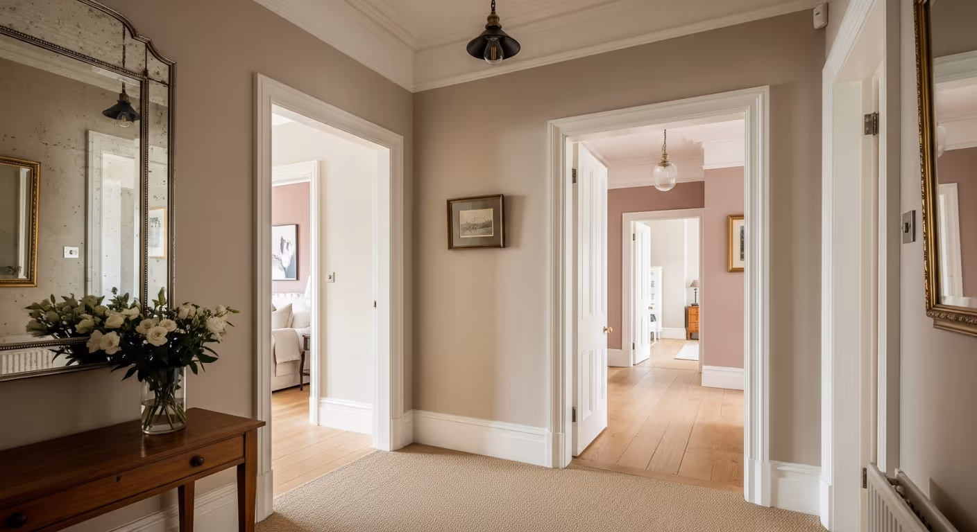 Since hallway walls should follow your rule of matt or soft sheen only, this is also a good space to keep finish decisions practical and colour decisions steady.
