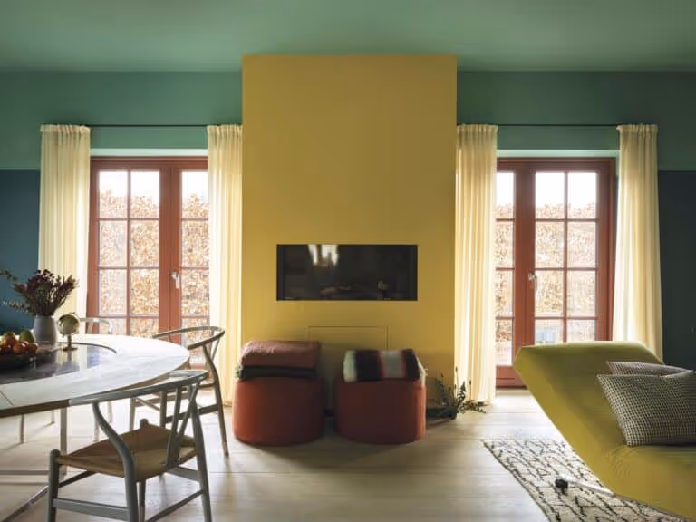 This image is the perfect display of how feature walls can work to tie a room together. Muted pastel variations of primary colours from Farrow and Ball’s Scandi collection create a balanced yet dynamic look, matching key pieces of furniture and drawing the eye towards the feature wall focal point. The yellow is just perfect — soft yet uplifting, adding warmth without overpowering the space.