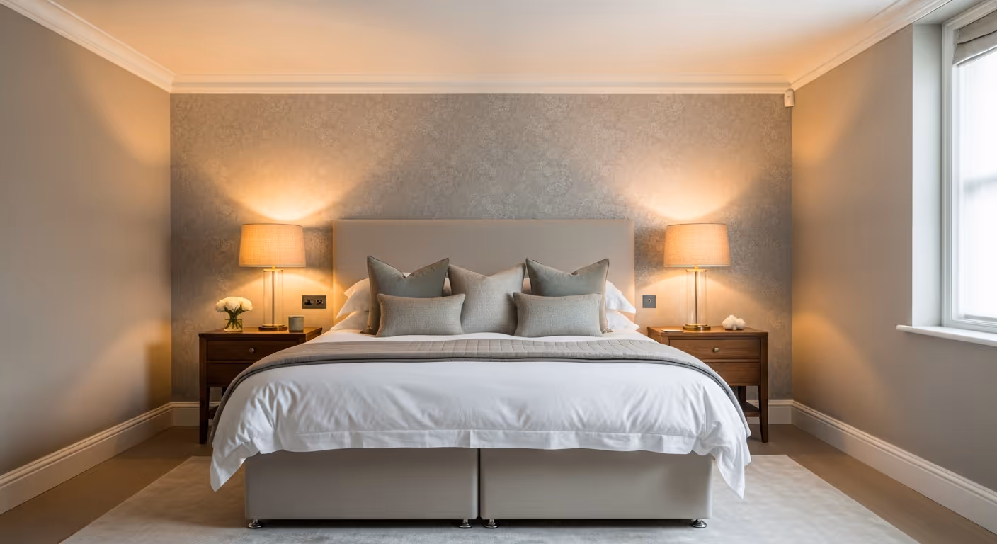 [Google Imagen prompt for inline image: Kensington bedroom showing wallpaper headboard wall with painted side walls in matching neutral, no people, warm bedside lighting, realistic photo]