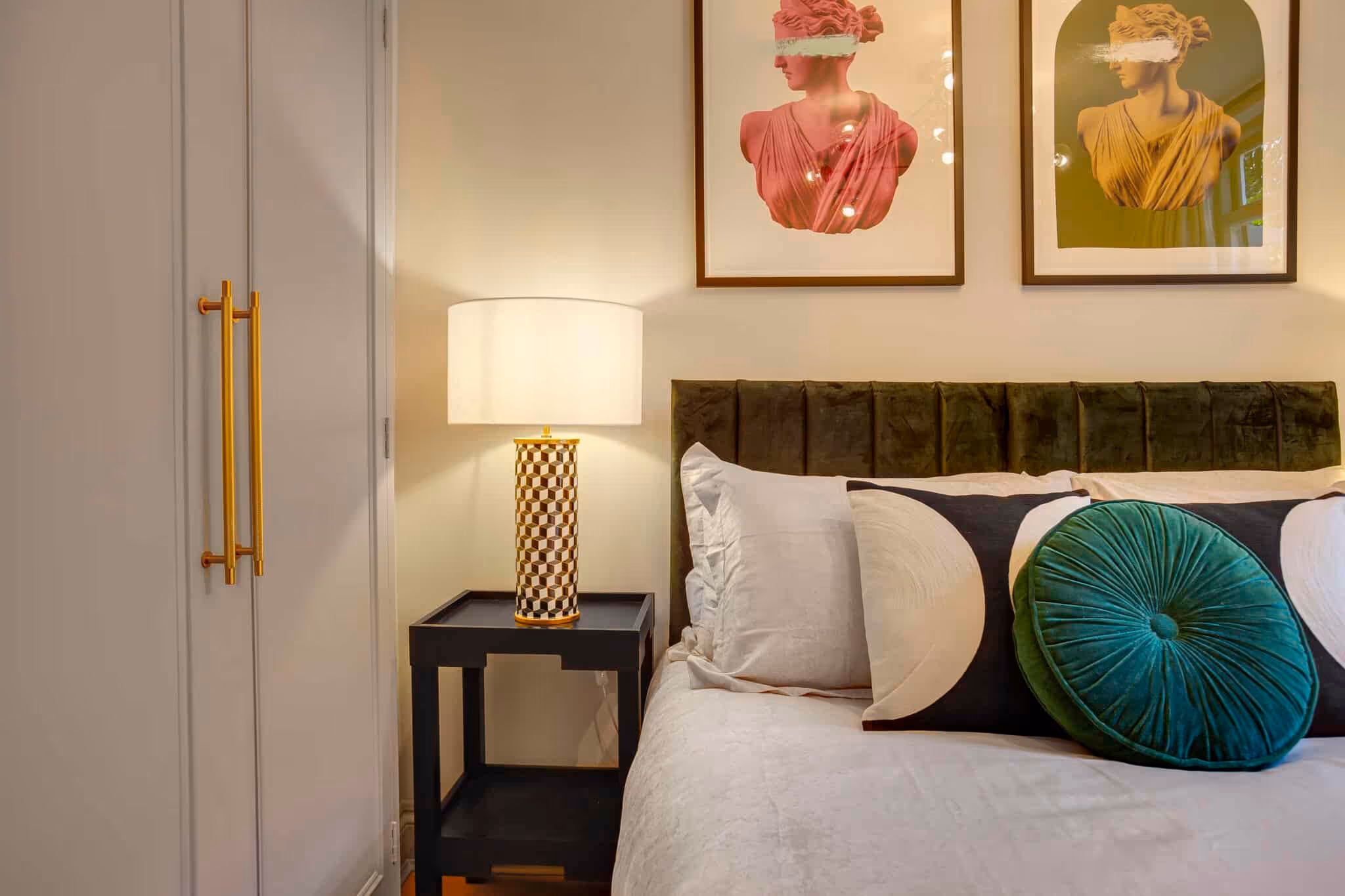 Working to designer Samantha Goodhew’s vibrant and distinctive vision, Bellefair carried out the full decorating package throughout this bold South Kensington home. Rich, saturated tones were used across walls, ceilings and woodwork to dramatic effect — from deep greens and aubergines to pops of fuchsia and gold. All surfaces were meticulously prepared using premium materials to ensure a flawless finish. In the main living and dining areas, the ceilings were fully skimmed and finished in a high-gloss lacquer, creating a striking mirror-like reflection that elevates the space and enhances the colour scheme. The result is a confident, character-rich interior completed with exacting attention to detail.